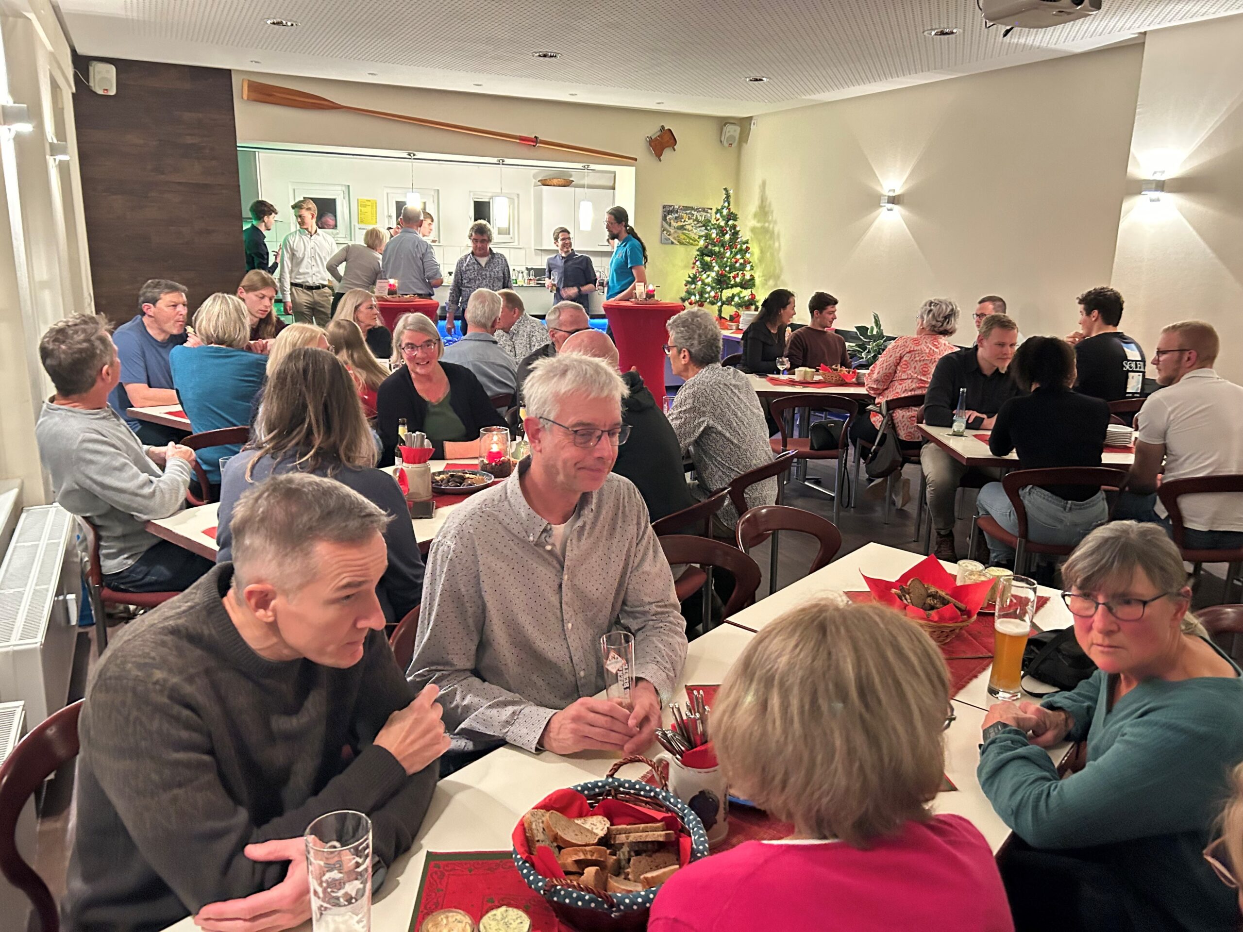 Das Organisationsteam rund um Christoph konnte sich über einen großen Zuspruch freuen, ziemlich genau 50 Mitglieder und Freunde des Vereins fanden am Samstagabend ab 19.00 Uhr den Weg ins Bootshaus. Die Teilnehmer der Weihnachtsfeier wiederum wurden mit einer prächtigen Stimmung, einem umfangreichen Weihnachtsmenü und einer kurzweiligen Sportlerehrung für ihr Kommen belohnt.